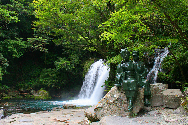 河津七滝は片道約1時間かけて巡ることが出来る全長850mの遊歩道があり、46mの吊り橋や伊豆の踊り子像が2ヶ所あります。