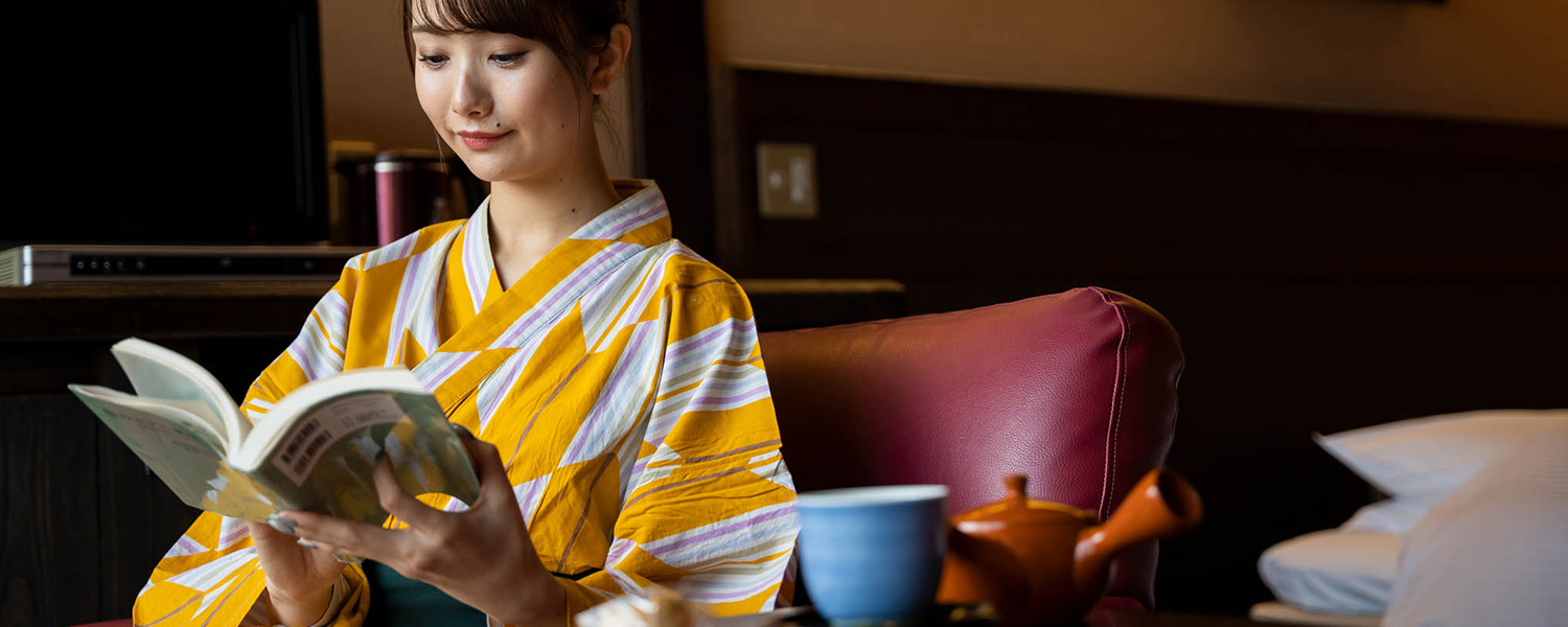 浴衣に着替えてお部屋でまったり。お茶の香りがほのかに漂います。